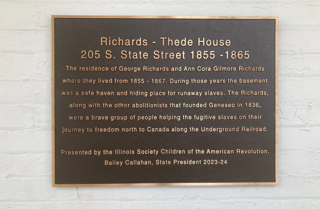 The sign is on the front of the Geneseo Historical Museum identifying the Museum as a site of the hiding hole for the Underground Railroad. There also is a second sign from the DAR-CAR identifying the museum as the Richards-Thede Historical Home of the Underground Railroad, and that sign will be put in place by the front walkway. Photo by Claudia Loucks