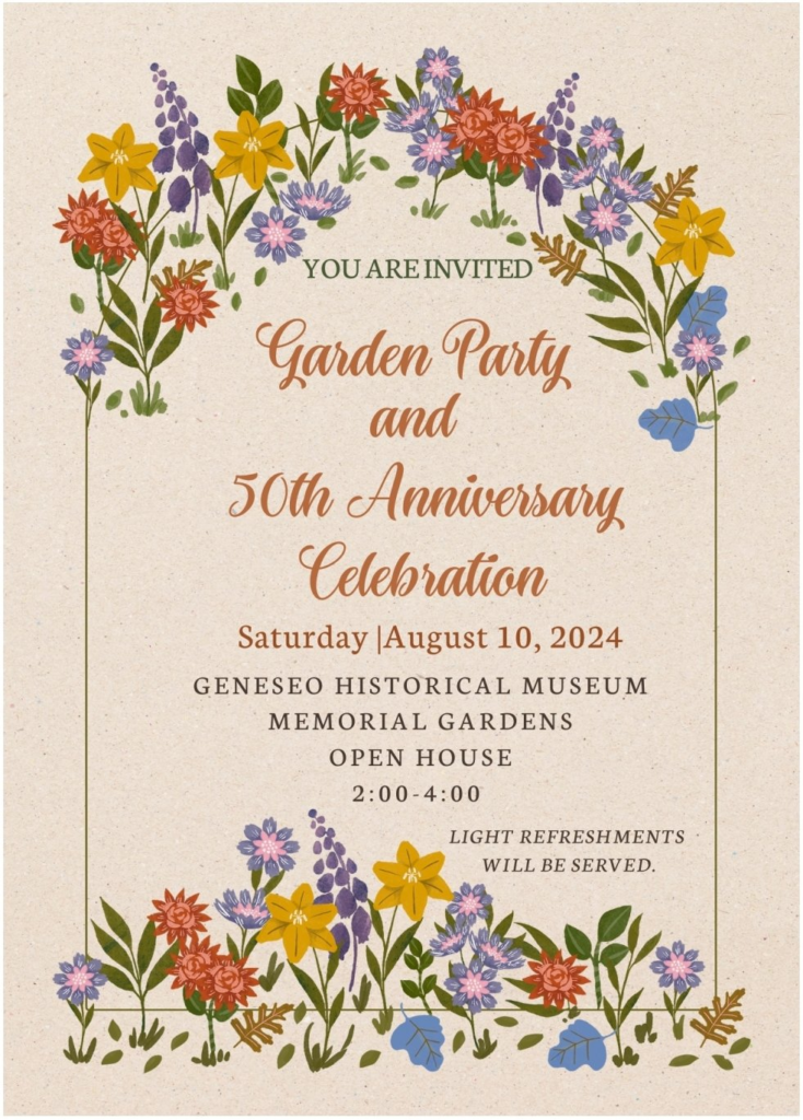 Area residents are invited to a Garden Party to celebrate the 50th anniversary of the Geneseo Historical Museum. The party will be from 2 to 4 p.m. on Saturday, Aug. 10, in the memorial gardens of the museum at 205 South State St., Geneseo.